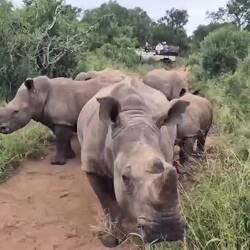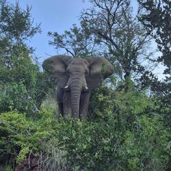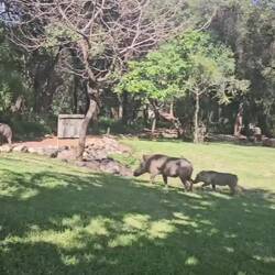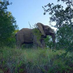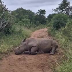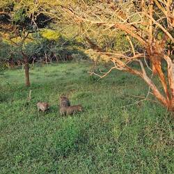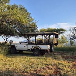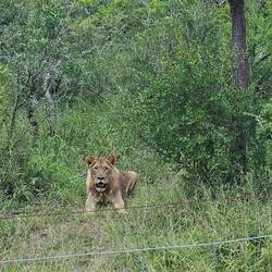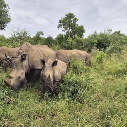 Morgens um 05:30 Uhr geht es das letzte Mal auf eine Safari. Wir sehen Nashörner, Büffel und einen Löwen eines benachbarten Reservates.