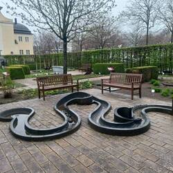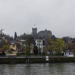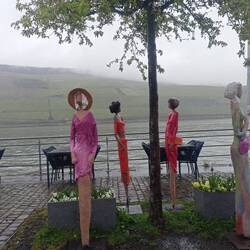 So brechen wir erst um 11 Uhr zum Bahnhof auf und fahren mit dem Zug nach Rüdesheim. Dort regnet es immer noch, aber nicht mehr so stark. Wir nehmen gleich die Autofähre nach Bingen und laufen die NST-Kilometer bis zum Hauptbahnhof ab. Der Weg am Rheinufer entlang ist schön. Das Wetter weniger. Zeit für einen Kaffee und ein Glas Wein. Die Fußgängerfähre bzw. deren Ersatz durch ein Rheinboot bringen uns direkt zum Zentrum von Rüdesheim. Wir gehen an der Kirche vorbei zu unserem Hotel und checken erstmal ein. Der Regen wird immer weniger und die Wettervorhersage für den Rest des Tages ist gut.