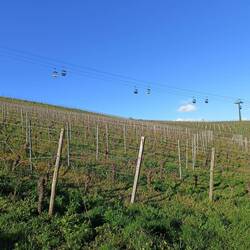 Wir schlendern zum Bahnhof und nehmen den Zug nach Assmannshausen. Dort stärken wir uns mit Kaffee und Kuchen im gleichen Lokal, wo wir gestern zu Abend gegessen haben. Dann geht's auf den NST bzw. Rheinsteig nach Rüdesheim. Erstmal bergauf zum Jagdschloss. Die Seilbahn dreht sich. Aber niemand fährt mit. Wir auch nicht.
