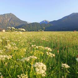 Der Zeltplatz hält was er verspricht. Ich schlafe ordentlich und mich belästigen weder Braunbären noch Kühe. Ein paar menschliche Geräusche von der Party an einer nahen Alpe stören wenig. Um halb sechs geht es los. Ich laufe durch Wiese und Weide hinunter zum Alpsee. Die Kühe liegen noch schlaftrunken auf der Wiese. Ich bin wach da es recht kühl ist. Im Alpsee zieht ein Schwimmer im Neopren seine langen Bahnen. Biergärten und Cafés werden für den Sonntag präpariert. Das Wetter ist herrlich.