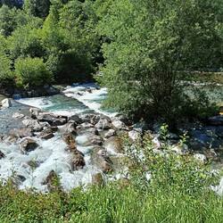 Ich bin etwas überrascht, wie schön doch dieser Weg durch das Illertal ist. Das macht nicht die Wegbeschaffenheit. Sondern die tolle Sicht bei diesem Wetter auf die Allgäuer Hochalpen links und die Berge rechts. Und die wunderbare Unterhaltung. Ich lerne viel wie man die Welt im großen, den NST im mittelgroßen und das Illertal im kleinen mit den Augen eines Künstlers sieht. Der Künstler bin nicht ich. Nur die Versorgung mit Kaltgetränken auf der Strecke läßt zu wünschen übrig. In Fischen machen wir einen kleinen Umweg ins Zentrum um das in einem Biergarten zu ändern. Das gelingt.