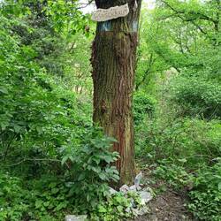 Nach der Erbsensuppe jage ich Schnitzel. Die der Ernie für mich in einem uralten Weißdornbusch hinter einer ururalten Eiche mit Bank davor versteckt hat. Also nicht wirklich Schnitzel. Nette Trail Magic. Ich finde diese tatsächlich. Allerdings war wohl auch eine Fernwandermaus hier und hat die Tüte durch- und einen Riegel angeknabbert. Nicht zu glauben, der war für mich! Vielen Dank an Ernie, hat Spaß gemacht. Und das Brillenputztuch kann ich gut gebrauchen. Wegen der Mäuse unterlasse ich es, Trail Magic für den nächsten NST-Thruhiker dazulassen.