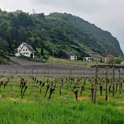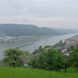 Der frühe Vormittag ist wieder sehr diesig. Der Nebel löst sich früher auf als gestern. Es ist noch einmal eine richtige Rheinsteig-Roller-Coaster-Etappe. Sehr steil bergab bis zum Rhein und dann gleich wieder noch steiler bergauf zur nächsten Ley. Auf manchen Singletrails ist das Gras hüfthoch und am Morgen sehr nass. Deshalb sind Schuhe und Hose bald tropfnass. Aber es ist warm.