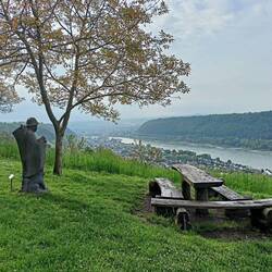 Schnell geht es an der Jugendherberge vorbei aus der Stadt in den Wald. Es geht linksseitig den Rhein abwärts. Auf der anderen Seite kann ich den Rheinsteig ahnen. Der Wald ist schön. Auch die Ausblicke gut. Da es am Soonwaldsteig wohl etwas problematisch mit der Wasserversorgung ist trinke ich bei erster Gelegenheit im Forsthaus Heiligkreuz ein Bierchen. Wenn es kein Wasser gibt gehen bestimmt auch andere Flüssigkeiten.