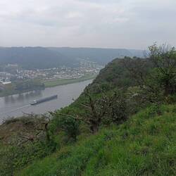 Bis Vallendar ist der Weg nicht so spannend. Aber dann geht es Rheinsteigtypisch steil auf und ab durch Wald und Wiesen. Die Natur hier ist ein Stück weiter als im Westerwald. Das milde Klima und die geringere Höhe machen gerade zu dieser Jahreszeit einen großen Unterschied. Apfelbäume blühen, Rapsfelder sind knallgelb, die Buchen haben ihr volles, aber noch hellgrünes Blätterkleid, ein Bauer hat schon das erste Mal gemäht. Sehr schön alles, trotz des semioptimalen Wetters. Der vorletzte Abstieg des Tages geht ins Tal des Brexbachs an einem rekonstruierten Römerturm vorbei. Im Brextal ist es richtig schön. Das Pfadfinderlager ist leer. Ich nehme an dass das am Wochenende auch anders war.