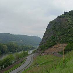 Ich frühstücke am Schloss Arenfels. Letztes Jahr haben wir hier Mittag gegessen. Heute früh ist natürlich nicht auf. Also Frühstück aus dem Vorrat mit Superblick über Weinberge und Rhein. Der nächste tolle Ausblick folgt hinter Reinbrohl auf der Reinbrohler Ley. Dann geht es durch Wald und ein Bachtal hinunter nach Hammerstein. Am Weingut Scheidgen haben wir letztes Jahr einen Super-Riesling gehabt. Diesmal gehe ich vorbei. Nochmal hoch an der Burg oberhalb von Hammerstein vorbei, wieder ein Stück runter und ein letzter Anstieg auf die Höhe über den Leutesdorfer Weinbergen. Da geht es noch zwei Kilometer lang bis zur Edmundshütte.