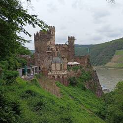 Das nächste visuelle Highlight ist die Burg Rheinstein. Sehr gut erhaltene Rheinromantik und als Hotel genutzt. Dann endet das Stück am Rhein. Es geht hinein ins Tal des Morgenbachs. Der rauscht mächtig und bahnt sich seinen Weg durch ein wundervolles Tal mit urigen Felsformationen und schönem Wald. Der Anstieg ist lang, aber viel sanfter als die Anstiege am Rheinsteig.