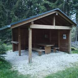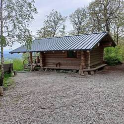 Die Hütte ist eigentlich ein richtiges Blockhaus. Mit rustikaler Einrichtung, Schlafboden, Kronleuchter und USB-Kabeln zum Laden. Es gibt Wasser klassisch oder naturell gegen eine kleine Spende. Ich finde einfach keinen Grund zum Weitergehen. So sitze ich jetzt auf der Bank auf der Terrasse, schreibe den Footprint und genieße den Abend.Read more