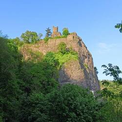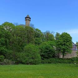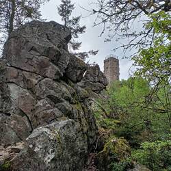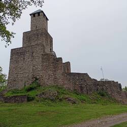 Runter geht es jetzt bis zum Ulanendenkmal. Dann wieder hoch zur Löwenburg. Also erstmal ins Gasthaus. Es ist Mittagszeit und die Bude gut gefüllt. Für mich gibt es einen großen Teller Linsensuppe und ein Weizen dazu. Dann mache ich den Abstecher hoch zur Burg. Da bin ich fast alleine. Die Aussicht ist immer noch bescheiden.