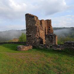 Anderthalb Stunden sind rum. Ich schaue mir langsam das schöne Dorf an und mache den kleinen Umweg zur Burgruine. Hier war der Sitz der Grafen von Sayn im Hochmittelalter. Der Blick auf die Sieg hinunter ist genial.