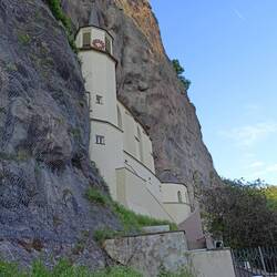 Auch vom Geisberg aus sieht man nicht viel. Das Milchhäuschen hat auch noch geschlossen. Die Drachenburg ebenfalls. Aber da wollte ich eh nicht rein. Eine Bahn kommt den Berg hochgeschnauft. Sie ist voll. Keiner steigt aus. Ist wohl eine Reisegruppe auf dem Weg zum Drachenfels. Als sie sich oben auf der Aussichtsplattform versammeln bin ich auch schon da. Ich ernte bewundernde Kommentare. Ich gehe hoch zum Fels. Dort ist eine Jugendgruppe aus Frankreich versammelt und singt lautstark Schnappi auf deutsch mit französischem Akzent. Sehr unterhaltsam.