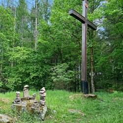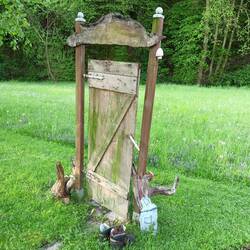 Der Weg geht nun stetig bergab und mehr über Wiesen und Felder als durch Wald und Waldtrümmer. Es regnet nun erst wenig, dann ziemlich stark, dann wieder weniger. Der Forellenfranz ist leider nicht an seinem Anwesen. Ich setze mich trotzdem vor seine Hütte. Ich glaube ich hätte mich gut mit ihm unterhalten.