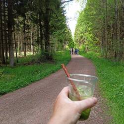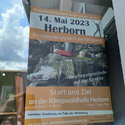 In Herborn stehen ein Start-Ziel-Zeichen und viele Menschen. Ich denke zunächst, dass das für mich ist. Ziel der Etappe nach und Start der Etappe aus Herborn. Als mir niemand zujubelt wird klar dass der Anlass ein anderer sein muss. Sieht auch eher wie ein Megamarsch aus. Leute mit kleinen Rucksäcken stehen herum und essen und trinken. Tatsächlich. Es gibt eine Sieben- und eine Neunkilometerrunde. Sie nennen es auch lieber Genusswanderung. Das gefällt mir gut. Ich versorge mich erstmal mit festen und flüssigen Kalorien. Dann laufe ich los. Die Genusswanderung geht entlang des Saar-Hunsrück-Steigs. Das passt mir auch gut. Nach zwei Kilometern gibt es den nächsten Genuß. Cocktails. Ich lasse mir einen Mojito machen und schlürfe ihn im Weitergehen. Er ist fast alle als nach weiteren zwei Kilometern der Wein- und Bretzelstand kommt. Ok, ich brauche eh eine Pause. Dann nochmal zwei Kilometer bis zur Brilliantbar. Da gibt es Sekt mit einem edlen Stein dazu. Ok, der Ausblick hier ist super. Dann geht mein Weg hoch zum Wildenburger Kopf. Die Genusswanderer biegen ab zurück nach Herborn. Das war doch mal Trailmagic vom feinsten. Die Veranstaltung findet zum dritten Mal statt. Und immer war gutes Wetter. Auch heute ist das Wetter fein.