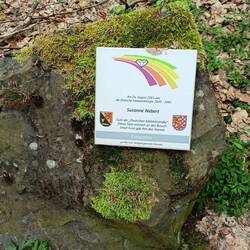 Das erste Ziel ist Herborn. Vor dem Ort gibt es ein steinernes Gästebuch. Dort dürfen die Berühmtheiten, die die Edelsteinstraße besuchen, sich mit einer Plakette an einem Stein verewigen. Viele davon sind ehemals amtierende Wein- oder Edelsteinköniginnen. Manche auch tatsächlich bekannt.