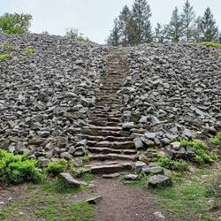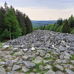 Um halb elf dackele ich los. Erstmal langsam durch Brilon. Ich schaue mir noch einiges an. Dann langsam bergauf aus der Stadt. An der ehemaligen Sprungschanze vorbei zur Möhnequelle. Borbergs Kirchhof ist eine mittelalterliche Kirchenruine mit Wallanlagen und Mauerresten drumrum. Ein schöner Blick ins Tal. Natürlich mit gerodeten Fichtenhängen. Hier auf dem Rothaarsteig finde ich das erstmal nicht so deprimierend wie gestern. Es sind immer wieder tolle Fernsichten zu haben, wo man vor dem Borkenkäfer durch Wald gelaufen ist. So ähnlich kenne ich das vom Kamm des Thüringer Waldes. Hier gibt es allerdings auch immer wieder Flächen mit jungen gesunden Fichten. Denen kann Borki offenbar nichts anhaben.
