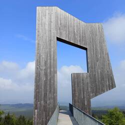 Es beginnt der langsame Aufstieg auf den Erbeskopf. Mit 816 Metern ist das der höchste Berg in Rheinland-Pfalz. Im Hunsrückhaus unter dem Skihang bekomme ich einen Automatenkaffee. Das richtige Café hat leider nicht auf. Nach dem finalen Anstieg auf den Berg besteige ich noch den Aussichtsturm. Es ist leicht diesig, deshalb kann man nicht weit schauen.