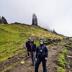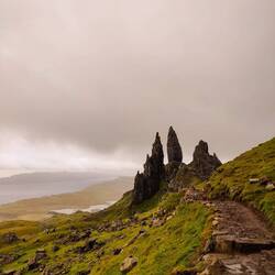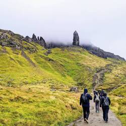 Etwas salopp gesagt, ist der Old Man of Storr eine Felsformation, zu der man hochläuft um sich vor dieser zu fotografieren. Sieht ein bisschen wie ein übergrosser Hinkelstein von Obelix aus. Und obwohl die Wanderung dorthin sicher eine Stunde dauert, findet sich auf dem Weg alles, was es an Touristen zu bieten gibt. Von top ausgerüsteten Pros bis hin zu Insta-Chicks mit dünnen Sneakers und Sonnenbrille (bei Regen).
