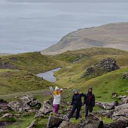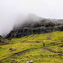 Heute holte uns das Schottische Wetter doch noch ein. Wir erwachten zu Nebel und Regen und nahmen den Tag entsprechend langsam in angriff mit etwas Yoga und einem Zmorgen mit Porridge, Toast und Kaffee. Sollte es ein „Hanger-Day“ werden? Nein! Um halb zehn rief Stef zum Aufbruch, denn wir wollten auf Skye unbedingt die Wanderung zum berühmten Old Man of Storr machen, DER Natur-Attraktion auf der Insel. Und die Wetterprognosen für den Tag darauf sahen eher schlechter aus. Heute sollte es zumindest öpe bis 13 Uhr trocken bleiben (was ziemlich hinkam). Also setzten wir uns zu viert ins Auto und fuhren eine Stunde nordwärts. Angekommen, peitschten uns ein kalter Wind und Nieselregen in die Gesichter. Wir fragten gleich noch einen einheimischen Typen nach Routentipps und bemerkten den Wetterumschwung. Er meinte trocken: „Today is one of the good days.“