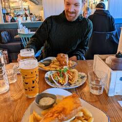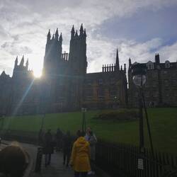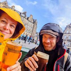 So ging’s am nächsten Tag relativ direkt weiter nach Edinburgh, wo wir unseren Mietwagen retournierten und uns ein Mitarbeiter (ein Flüchtling aus der Ukraine) von Europcar danach netterweise ins Zentrum mitnahm. Die Stadt empfing uns mit heftigen Windböen und Regen, also schnell in den nächsten Harry Potter Laden, um MJ Mütze und Schal zu kaufen. :) Auf Sightseeing hatten wir dann nicht wirklich Lust und zogen uns vorübergehend ins Appartement zurück, welches wir für zwei Tage mieteten. Als wir fürs Abendessen rauskamen, sah die Sache schon viel freundlicher aus und bei Sonnenschein entlud die Stadt ihren ganzen Zauber auf uns. Im Zentrum wirkt jedes Gebäude alt, ehrwürdig und man kommt kaum darum herum, permanent andächtige oder dramatische Filmmusik im Kopf abzuspielen. Trotz aller Ehrwürdigkeit aber gaben wir es uns nochmals richtig hart touristisch und zogen ins Bertis für Fish & Chips und Bier.