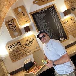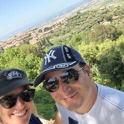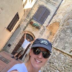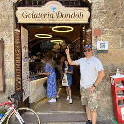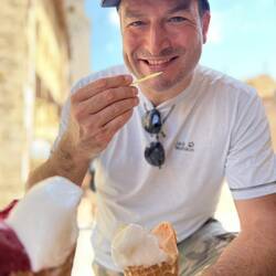 Naja wir fahren weiter und legen einen Halt in San Gimignano, einer wunderschönen Altstadt ein. Der ist Planmäßig für unser „2. Frühstück- EIS“. Sie ist inzwischen wirklich überlaufen aber es tut der Optik keinen Abbruch. Ich werde von einem riesigen Schokobrunnen magisch angezogen und kurze Zeit darauf später stehen wir mit gefüllten Backen mitten in einem Feinkostladen. Wir probieren Pralinen, Kekse und Pesto und müssen natürlich auch was kaufen 🤓. Aus dem 2. word dann wohl ein 3. Frühstück. Auf Empfehlung besuchen wir die beste Eisdiele der Welt und sind überrascht, das es davon gleich Mehrere gibt, wir halten und aber strickt an unsere Empfehlung von Karstens Kollege und müssen sagen ja lecker… da ich gestern bereits mein Weltbestes Schokoladeneis gefunden habe und ich mir das nicht nehmen will, esse ich Brombeere, Zitrone und Himbeer Rosmarin Eis, natürlich standesgemäß in der Waffel. Karsten hat sich für Zitrone, Passionsfrucht und Melone entschieden mmmhhhh… ich brauch mal wieder 5 Minuten, um die Beweise aus meinem Gesicht zu entfernen dann schlendern wir weiter. Ich erklimme noch den Turm… Bei 30 Grad eine tolle Erfahrung mit den Stufen und so… zum Bachtisch gibt’s noch ein Stück Pizza… 🤭.