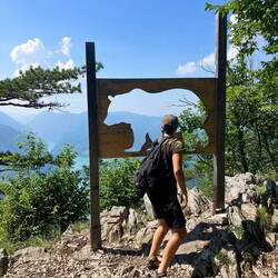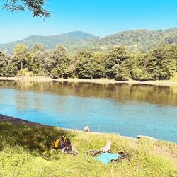 🥵Die nächsten Tage werden noch heißer wie dieser Tag sowieso schon. Das bekommen wir zu spüren, als wir die knapp 1000m hinunter zum Grenzfluss düsen und uns eine schneidend dicke Suppe empfängt. Es ist schon nach 18Uhr aber stehen bleiben ist beinahe unmöglich und der Fahrtwind schafft nur ein Bisschen Erleichterung. Klar denken können wir erst wieder nach einem Sprung ins kalte Wasser! 💦🏞️
