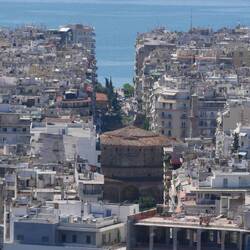 Da liegt sie, die Stadt Thessaloniki. Weiße, unzählige Häuser säumen den Hang der Bucht (Thermaischer Golf). Die Bucht als Teil der Ägäis trennt die Peninsula Chalkidiki von dem großen Teil des Festlandes weiter im Westen.