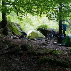 8. Nach einem von Heike unschlagbar gekochten Couscous und Gemüseratatouille lassen wir den Abend körperlich völlig erschöpft ausklingen. Wir liegen da, in unseren Schlafsäcken an einen Baum angelehnt, das Weinglas in der einen Hand und die Schokolade in der anderen und die Sterne funkeln zwischen den Baumkronen hindurch.
