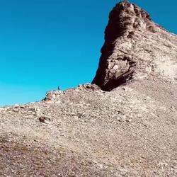 3. Der Nervenkitzel packt mich und ich gebe extra acht, dass jeder Hand- und Fußtritt sitzt und sich kein Felsbrocken durch mich aus der Wand löst. Selber abzurutschen ist eine Sache, aber jemandem einen Stein auf den Kopf zu schmeißen, eine andere. Der Blick runter zu Christoph, der unter mir in der Wand hängt, ist durchaus nicht schwindelfrei. Fast schon lustig, dass eine solche lose Wand auf diesen super bekannten Gipfel völlig ohne Seil, Tritt, Irgendwas- Sicherung für die Allgemeinheit zugelassen ist. In den Alpen wäre da wahrscheinlich ruck zuck ein Klettersteig daraus gemacht worden. Mir macht diese Aktion aber genau deshalb so so so viel Spaß. Endlich wieder was mit Actioooooooon (Das Berge runter Rasen gibt mir immer weniger den richtigen Kick...leider) .