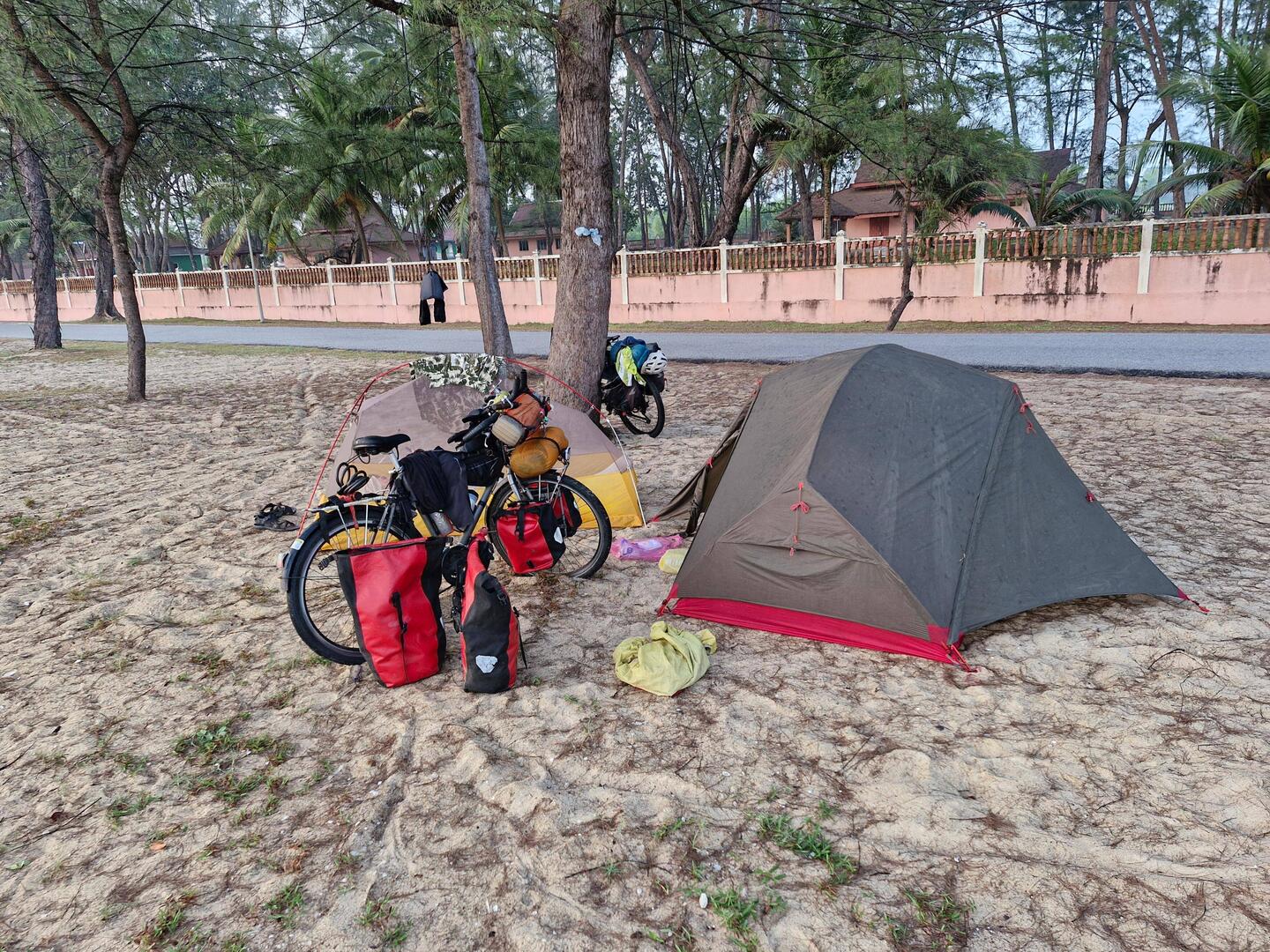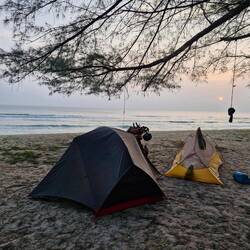 Installation des tentes sous un abri de pêcheur.