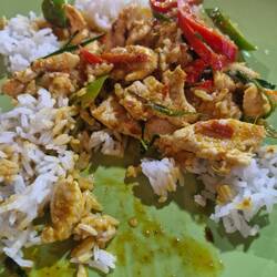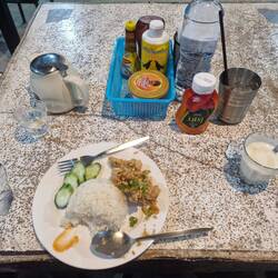 Petit déjeuner dans un restaurant dans le centre du village. Riz avec poulet basilic.