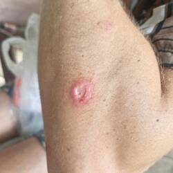 Nous nous arrêtons à la pharmacie pour lui trouver des médicaments. Il a un énorme bouton infecté sur la fesse.