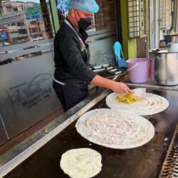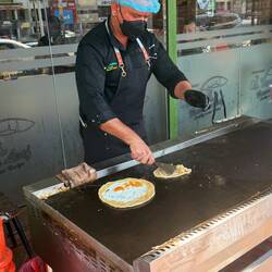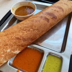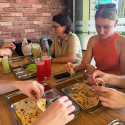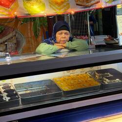 Schon draußen sieht man, wie auf einer großen heißen Platte die Roti Canai und Thosai frisch zubereitet werden. Dünn ausgezogen, gefaltet, gefüllt – und mit einem gekonnten Schwung gewendet. Unser Favorit heute: Roti Canai Sarang Burung Kambing – ein Roti mit zwei Spiegeleiern („Sarang Burung“ heißt Vogelnest) und würzigem Lammcurry. Dazu süßer Teh Tarik – der berühmte „gezogene Tee“ – und frische Säfte aus Wassermelone und Ananas.