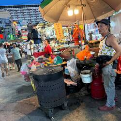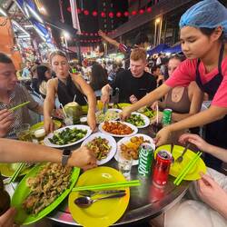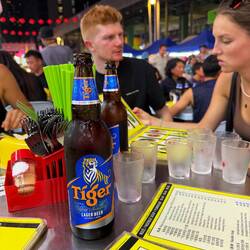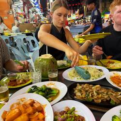 Wir fanden einen freien Tisch mitten im Gewusel, bestellten ein paar eiskalte Tiger Beer – die perfekte Begleitung für einen tropischen Abend – und blätterten durch die endlose Speisekarte. Es war unmöglich, sich zu entscheiden, also haben wir einfach alles genommen: gebratener Reis mit Ei und Gemüse, Calamari mit Chili, Brokkoli mit Knoblauch, Satay-Spieße mit Erdnusssauce, und dazu süß-scharfe Gerichte mit Garnelen und Tofu.