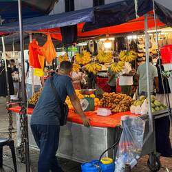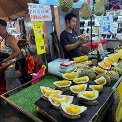 Zwischen all dem Gewusel dampfen Garküchen, und der Duft von gebratenen Kastanien liegt in der Luft. Gleich daneben schneidet ein Verkäufer die berühmte Musang King Durian auf – die „Königin der Früchte“, deren intensiver Geruch schon von weitem wahrnehmbar ist. 49 Ringgit pro Kilo – der Preis für ein echtes Stück malaysischer Kultur.