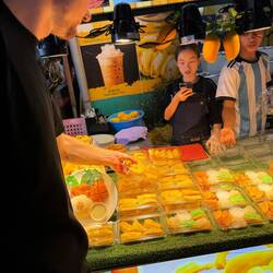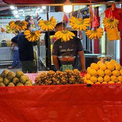 Ein paar Meter weiter türmen sich Mangostanen, Bananen und Rambutans. Die Händler rufen ihre Preise aus, das Licht der Neonröhren spiegelt sich auf den glänzenden Früchten. Dazwischen Touristen aus aller Welt, die mit einem kühlen Getränk in der Hand durch die Gassen schlendern, verhandeln oder einfach nur schauen.