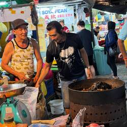 Nach einem erfrischenden Sprung in den Hotelpool sind wir am Abend nach Chinatown gelaufen. Sobald man unter das bunte Dach der Petaling Street tritt, ist man in einer anderen Welt – laut, bunt, duftend und ein bisschen chaotisch. Überall locken Stände mit Taschen, Uhren, T-Shirts und Sonnenbrillen – alles Marken, die man besser nicht zu genau anschaut, weil nichts davon wirklich echt ist.