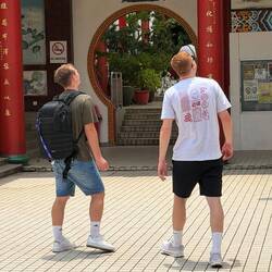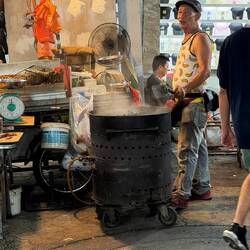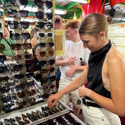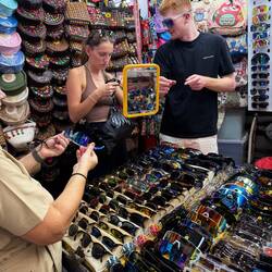 Paula, Jenny und Jeremias haben sich schließlich auf einen Stand mit Sonnenbrillen eingelassen – die Auswahl war riesig, und nach einigem Probieren war auch ein neues Modell gefunden. Der Trubel, das Stimmengewirr und die dichte, warme Luft – all das macht Chinatown so einzigartig.