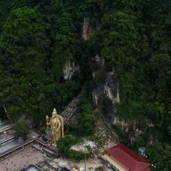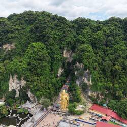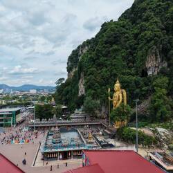 Zum Abschluss habe ich noch kurz die Drohne steigen lassen – ein kleiner Nervenkitzel, da man zwischen Kalkfelsen und Stromleitungen gut aufpassen muss. Der Blick von oben auf die goldene Statue, die bunten Treppen und das Grün der Kalksteinfelsen war aber einfach spektakulär – Kuala Lumpur im Hintergrund, die Natur im Vordergrund.