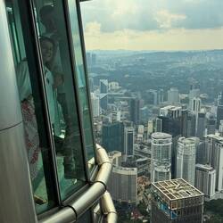 Zuerst ging es durch das Suria KLCC, das große Einkaufszentrum am Fuße der Türme, bevor wir mit dem Aufzug auf die Skybridge im 41. Stock fuhren. Dort, in 170 Metern Höhe, hat man das Gefühl, mitten in der Skyline zu stehen. Die Brücke verbindet beide Türme und schwingt leicht mit, wenn Wind aufkommt – ein interessantes Gefühl, wenn man in die Tiefe blickt. Danach ging es weiter hinauf zur Aussichtsplattform im 86. Stock, wo sich das ganze Stadtpanorama öffnet: von den grünen Hügeln im Hintergrund über das geschäftige Stadtzentrum bis hin zu den modernen Hochhäusern rund um den KLCC Park.