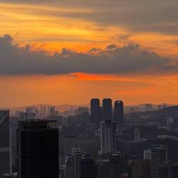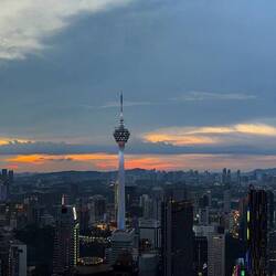 Zwischen Shopping und Abendessen wollten wir den Sonnenuntergang über Kuala Lumpur genießen – und dafür gibt es keinen besseren Ort als eine der Rooftopbars im Zentrum. Das Timing war perfekt: Die Sonne versank langsam hinter den Hügeln, während sich die Wolken zu einem dramatischen Abendhimmel formten. Ein Gewitter kam auf, zog wieder vorbei, und die Stadt leuchtete in wechselnden Farben – gold, violett, dann tiefblau.