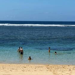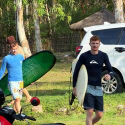 Heute wollten die Jungs noch einmal surfen gehen – zurück an den Spot, an dem alles angefangen hatte: Selong Belanak. Wir haben nur zwei Bretter im Surfshop abgeholt und sind dann gemütlich mit dem Auto an den Strand gefahren. Tamara und ich haben es uns dort bequem gemacht, während Jeremias und Lucas rausgepaddelt sind.