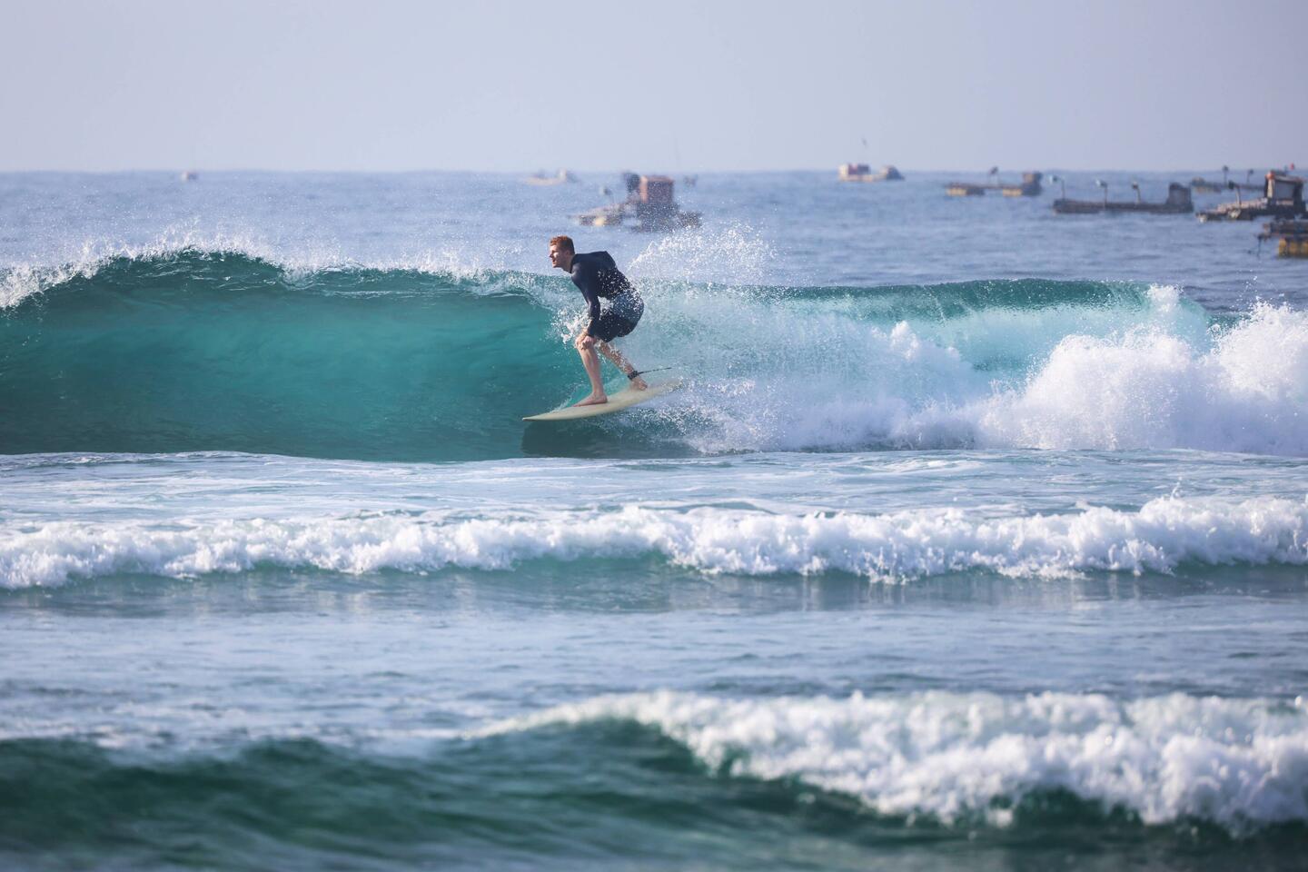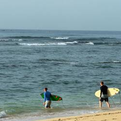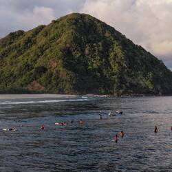Heute waren die Jungs schon um sieben Uhr morgens in der Tanjung Aan Bucht surfen. Ein Geheimtipp ist dieser Strand inzwischen nicht mehr – dafür aber einer der schönsten der ganzen Südküste Lomboks. Der feine, fast weiße Sand erstreckt sich über zwei sichelförmige Buchten, getrennt durch ein kleines Kap, von dem aus man einen wunderbaren Blick über das türkisfarbene Wasser hat. Früh am Morgen ist das Licht dort besonders schön – perfekt, um Fotos zu machen. Ich saß auf einem der Hügel oberhalb der Bucht, von wo aus man das gesamte Geschehen gut überblicken kann: die bunten Surfboards, die Fischerboote im Hintergrund und die endlose Weite des Meeres.