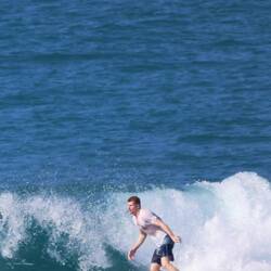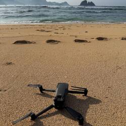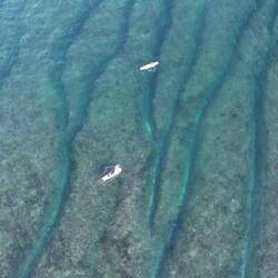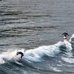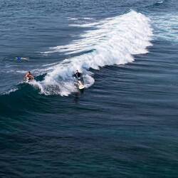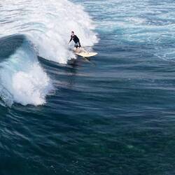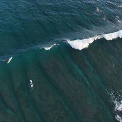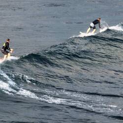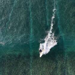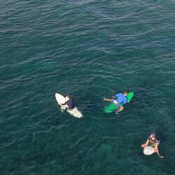 Das Meer war ruhig, die Sonne schon kräftig, und die beiden haben einige richtig schöne Wellen erwischt. Leider hatte der Tag auch einen kleinen Dämpfer – unsere große Drohne ist beim Flug über dem Wasser abgestürzt und versenkt. Sehr schade, sie hat uns auf so vielen Reisen begleitet.