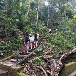 Der Weg führt durch dichten Regenwald, vorbei an Riesenfarnen, Lianen, Moosen und tropischen Pflanzen, bevor man schließlich in einem offenen Kessel steht, in dem das Wasser in mehreren Stufen von rund 45 Metern Höhe herabfällt. Die Gischt bildet einen feinen Nebel, in dem sich kleine Regenbögen zeigen, sobald die Sonne durchbricht.