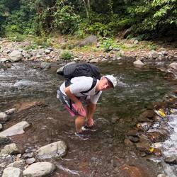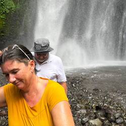 Etwas weiter hinten im Tal liegt der imposantere Tiu Kelep Wasserfall, oft als der schönste Wasserfall Lomboks bezeichnet. „Tiu Kelep“ bedeutet in der Sprache der Sasak „fliegender Teich“. Um dorthin zu gelangen, muss man mehrmals den Fluss überqueren, teils über glatte Steine, teils durch kniehohes Wasser – Flip-Flops sind da keine gute Idee. Unsere Kinder hatten recht, ihre Turnschuhe anzulassen, auch wenn sie am Ende durchnässt waren.