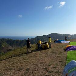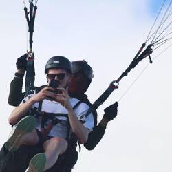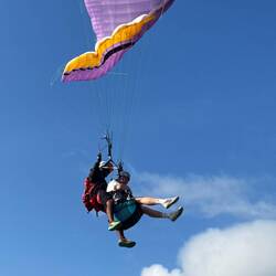 Die Fahrt den steilen Hügel hinauf war kürzer und weniger abenteuerlich als erwartet. Oben angekommen, dauerte es keine fünf Minuten, bis jeder seinen Piloten hatte – alles routiniert, freundlich und erstaunlich unkompliziert. Bei dem leichten Wind konnten sie fast aus dem Stand starten, und schon kurz darauf kreisten fünf bunte Schirme über uns am Himmel.