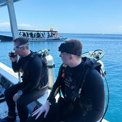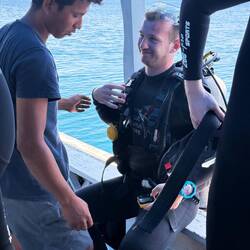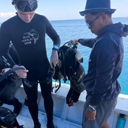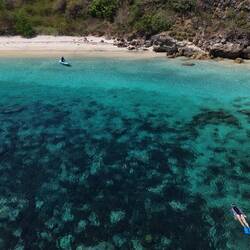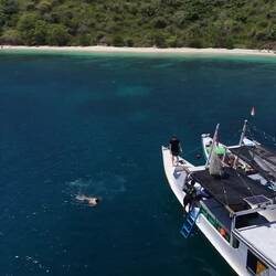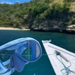 Nach einem kleinen Snack an Bord – frisches Obst und ein paar Kekse – ging es weiter zum zweiten Tauchgang. Diesmal tauchten und schnorchelten wir in der Nähe des berühmten Pink Beach und konnten von der Wasseroberfläche aus die beeindruckenden Klippen der Ostküste sehen. Das Spiel aus türkisfarbenem Meer, „rosa“ Sand und felsigen Formationen war einfach atemberaubend 🌞