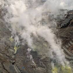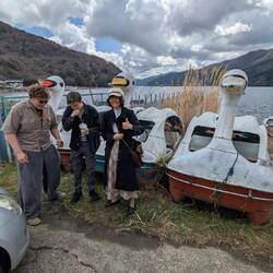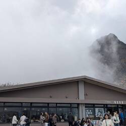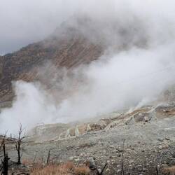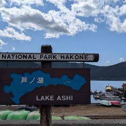Zwischendurch fuhren wir mit einer Seilbahn mit Zwischenstopp in Owakudani auf 1.044 m Höhe, wo aus dem Boden die schwefelhaltigen Dämpfe heraustrete, zum Lake Ashi. Da es sich um ein sehr beliebtes Ausflugsziel handelt, betrugen die Wartezeiten bei Auf- und Rückfahrt doch so um die 50 Minuten. Und es ist ja noch nicht einmal Hauptsaison.