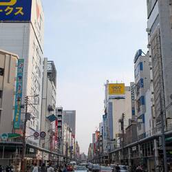 Es regnete praktisch den ganzen Tag, mal weniger, mal mehr. Wir waren in der Koch-/Gastroausstattungsstraße (Kappabashi Hondōri), erkennbar am Koch, der vom Dach in die Ferne blickt.