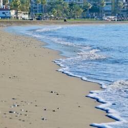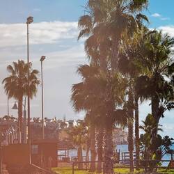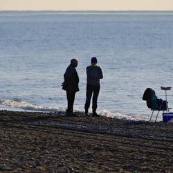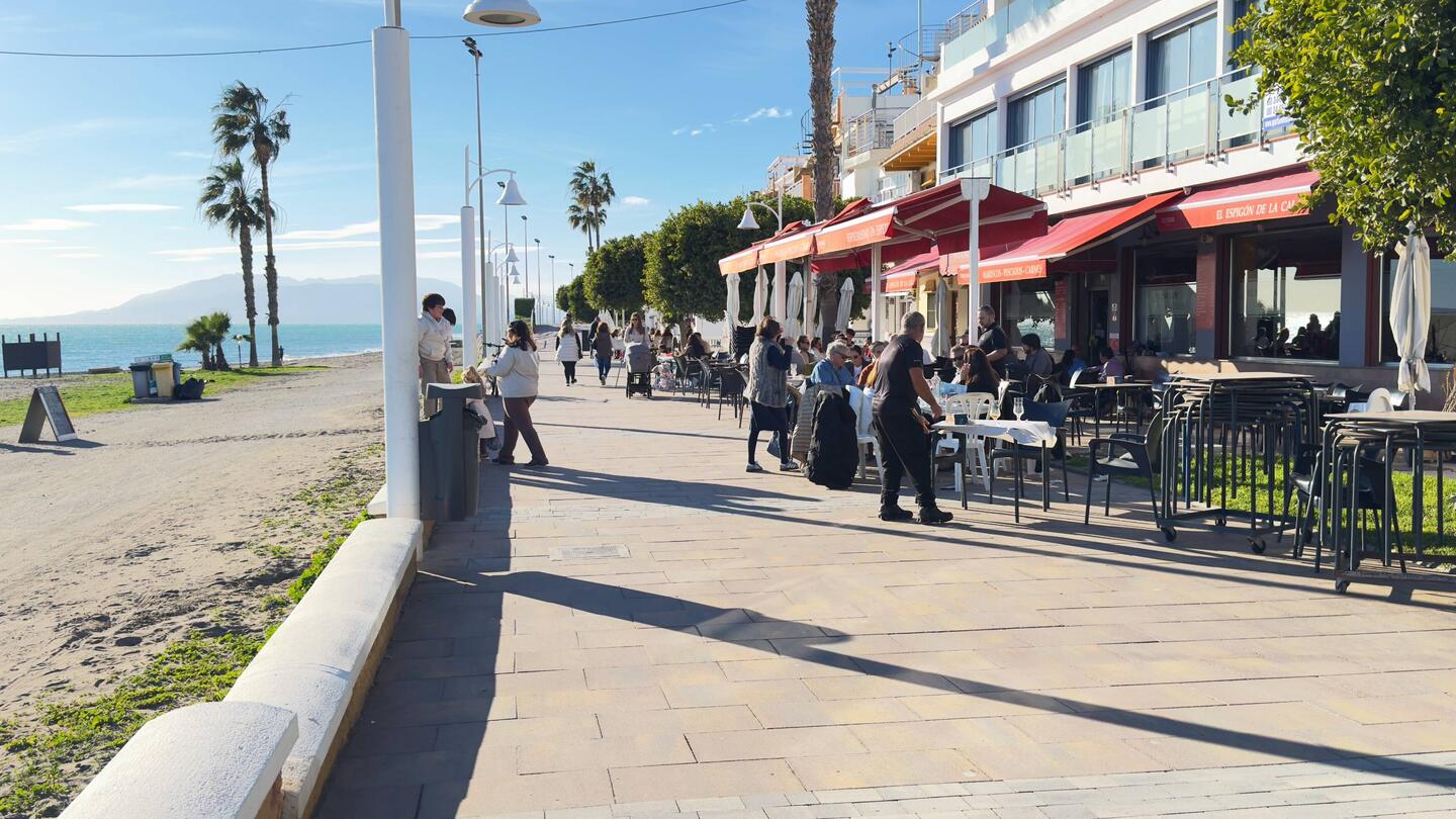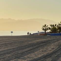 Wir haben 17 °C, es ist relativ angenehm und Samstag — alles ist auf der Strandpromenade und die Restaurants sind voll.